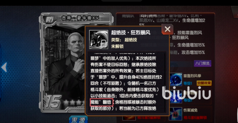 另一项超绝技【狂烈暴风】强化反击收益:每次成功反击后获得双倍怒气点数;被吉斯“被刺”技能命中的敌人无法恢复怒气值。该技能继承原绝技全部非直接伤害效果;若主攻击目标处于“噩梦”状态,则吉斯自身绝技抗性提升40%,持续2回合。