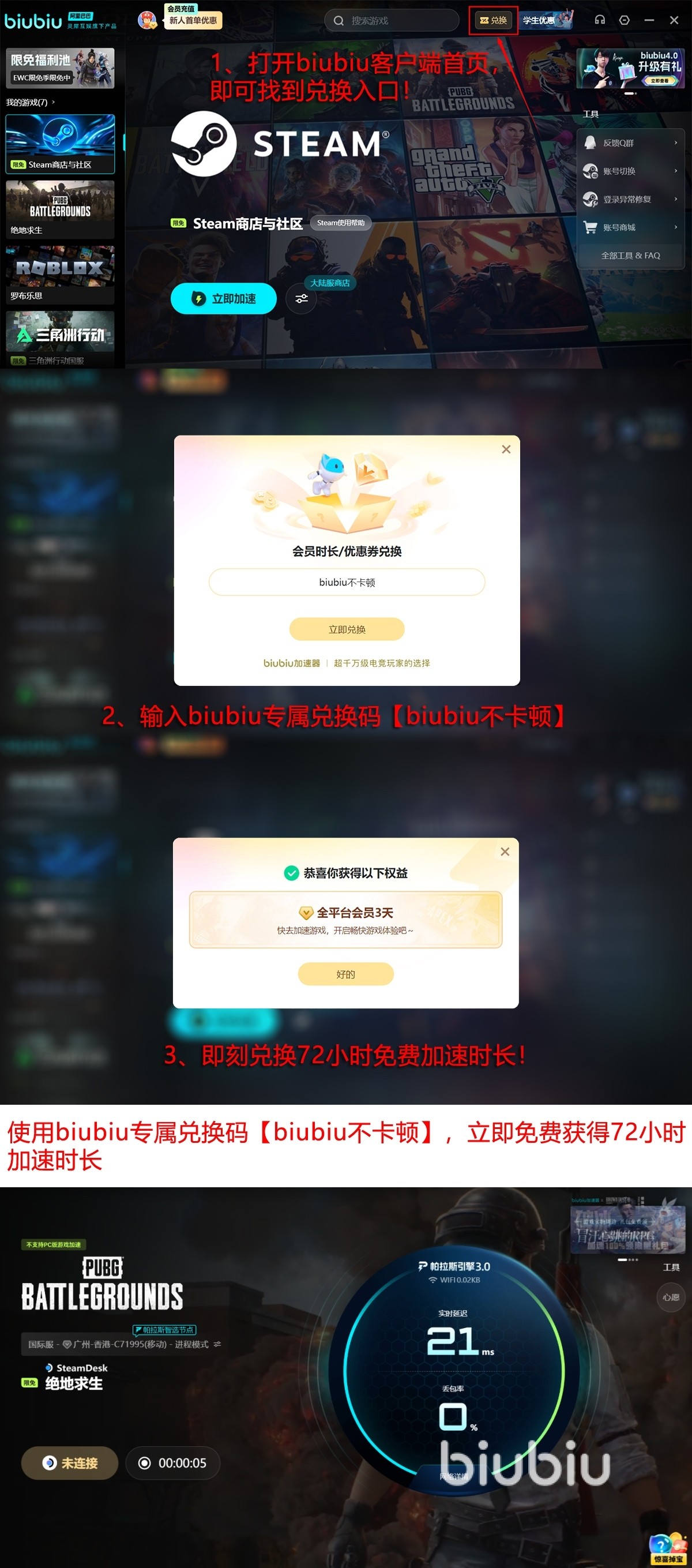 对于新用户,biubiu提供即装即用的友好支持策略:完成注册后自动获赠24小时全功能免费使用权限;此外,所有账号可在首页输入专属兑换码【biubiu不卡顿】,额外领取72小时服务时长。两项叠加可达96小时连续体验周期,充分满足调试网络设置、适配不同地图模式及多端设备兼容性验证所需。