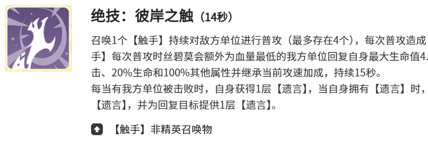 绝技“彼岸之触”是维持战线的核心续航手段。14秒冷却,召唤持续15秒的触手;触手继承本体80%攻击力、100%其他属性及20%最大生命值。期间持续攻击敌人,每次造成50%魔法伤害,并为己方生命比例最低的单位恢复4.1%最大生命值。当队友阵亡时触发“遗言陈述”,治疗效果可通过触手攻击转移至指定受疗目标,大幅提升容错率与战术灵活性。“暗影滋养”作为另一项关键被动,使角色在己方召唤物阵亡后,永久获得4%攻击速度与2%最大生命值提升,形成越战越强的滚雪球机制。