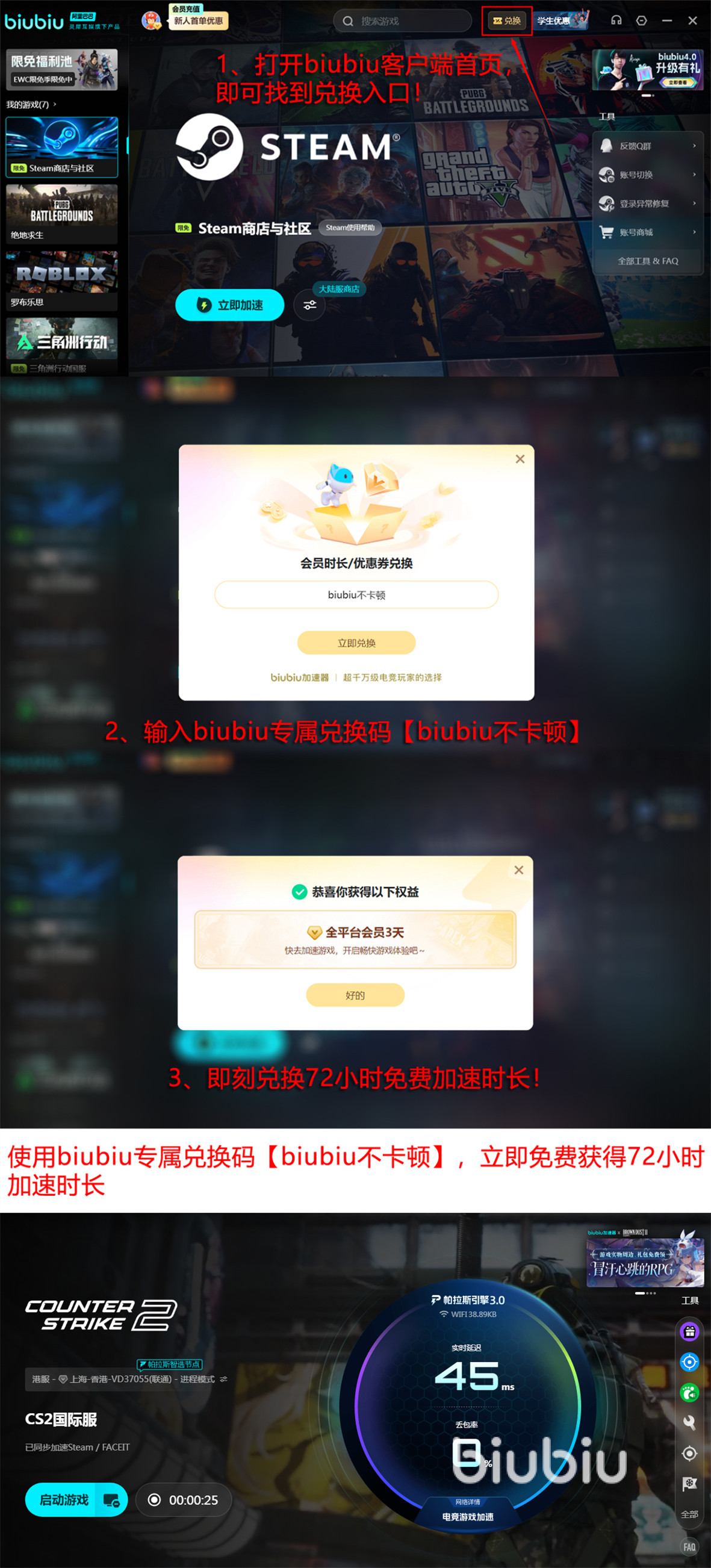 服务模式上,biubiu实行会员订阅制,同时面向新用户提供首次注册即享24小时全功能免费加速权益。此外,用户可凭专属兑换码【biubiu不卡顿】领取72小时加速时长,每个账号限用一次,适用于所有已接入游戏。平台同步开放免费社区功能,涵盖CS2战术讨论、地图解析、枪械配置分享及赛事资讯更新等板块,为玩家提供一站式内容交互空间。