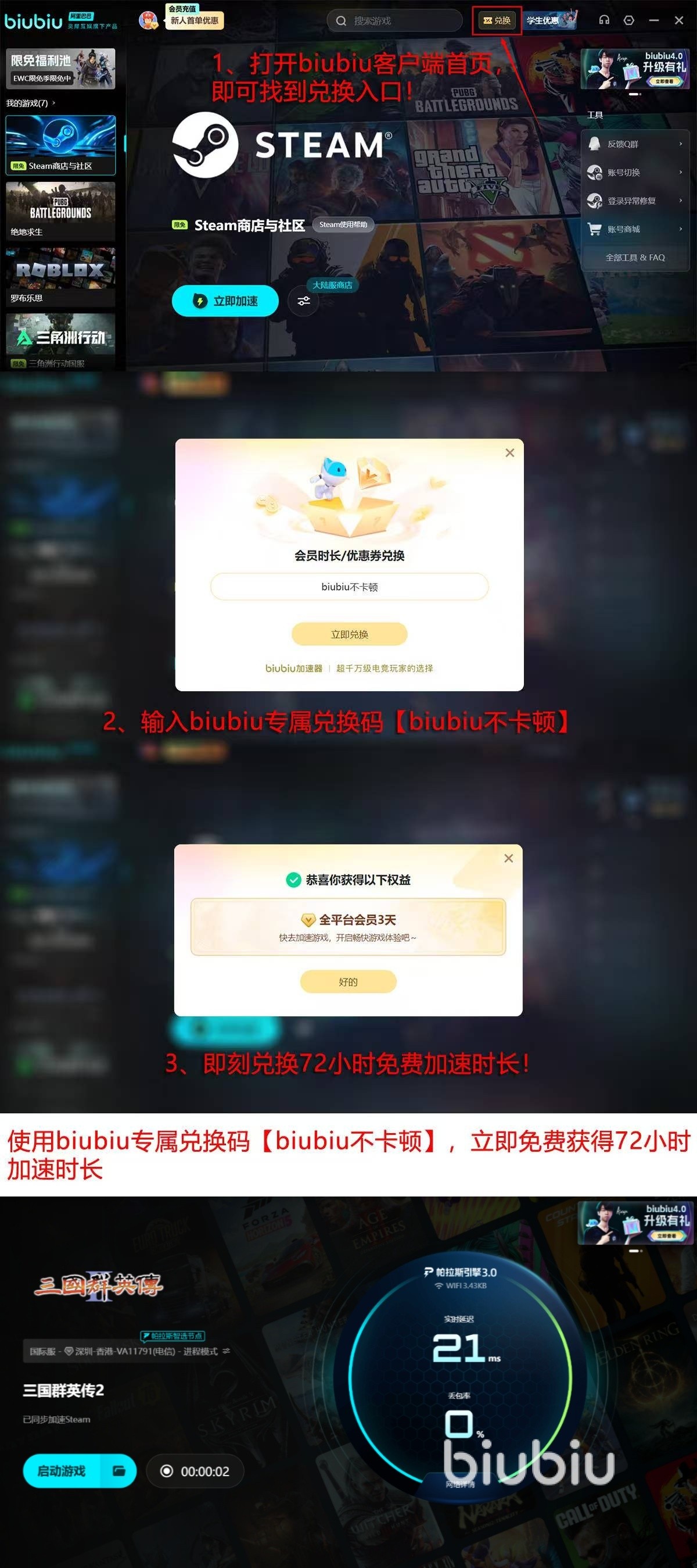现在使用还有两大福利,第一新人用户进行注册,会直接赠送24个小时免费加速时长,降低试用门槛,让新人们能直观感受到加速器带来的有效提升,第二使用【biubiu不卡顿】的专属兑换码,还能再额外获取到72小时的时长,两项叠加在一起后可以直接享受一共96小时的免费体验时间,让大家能轻松畅玩。