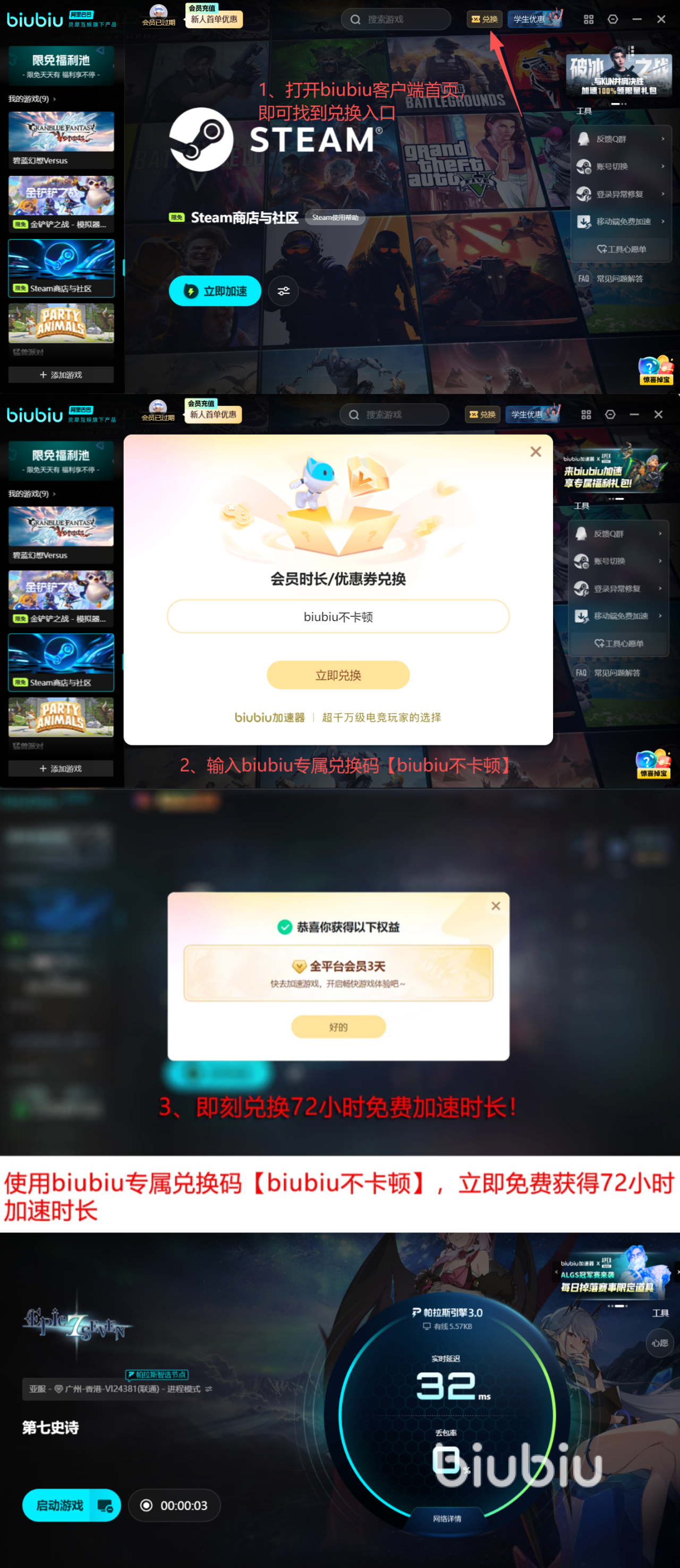 现在注册biubiu加速器,即可获得新人礼遇,注册即赠24小时免费全平台加速权益!另有口令加码,输入专属口令【biubiu不卡顿】,立即再享72小时加速时长!总计96小时免费加速体验,助你无忧探索第七史诗的瑰丽世界。