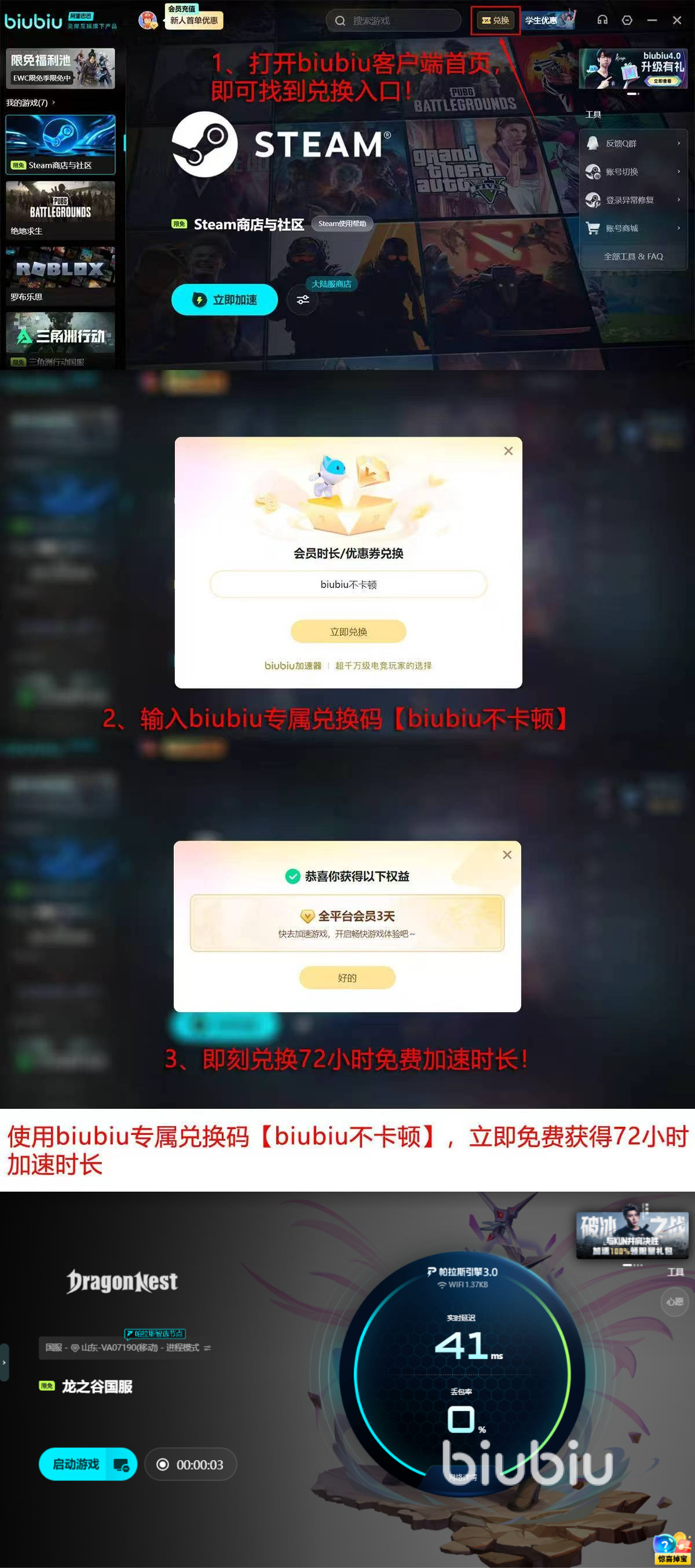 新玩家即刻畅享福利,注册biubiu加速器后,即刻激活首日24小时全功能免费试用,输入【biubiu不卡顿】足够深度体验流畅游戏72小时。双重福利叠加,新用户即可畅享优质加速体验总计96小时,轻松征服龙之谷中的各类挑战。