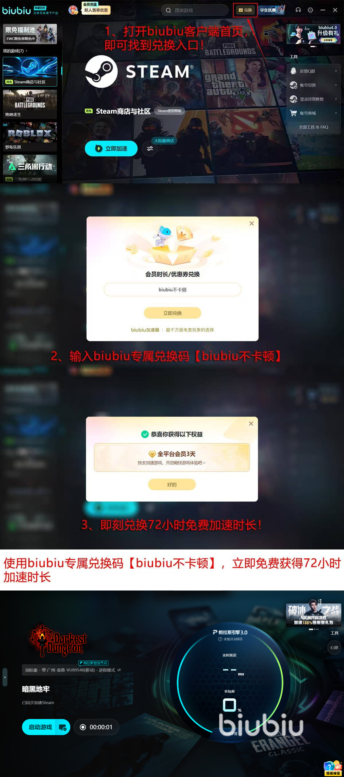 新玩家一注册就可以享受biubiu带来的多重加速福利,完成注册后可以获得首日24小时全功能免费试用,输入【biubiu不卡顿】可以继续无卡顿地进行暗黑地牢的72小时无压力闯关,共计96小时的顶级加速体验。