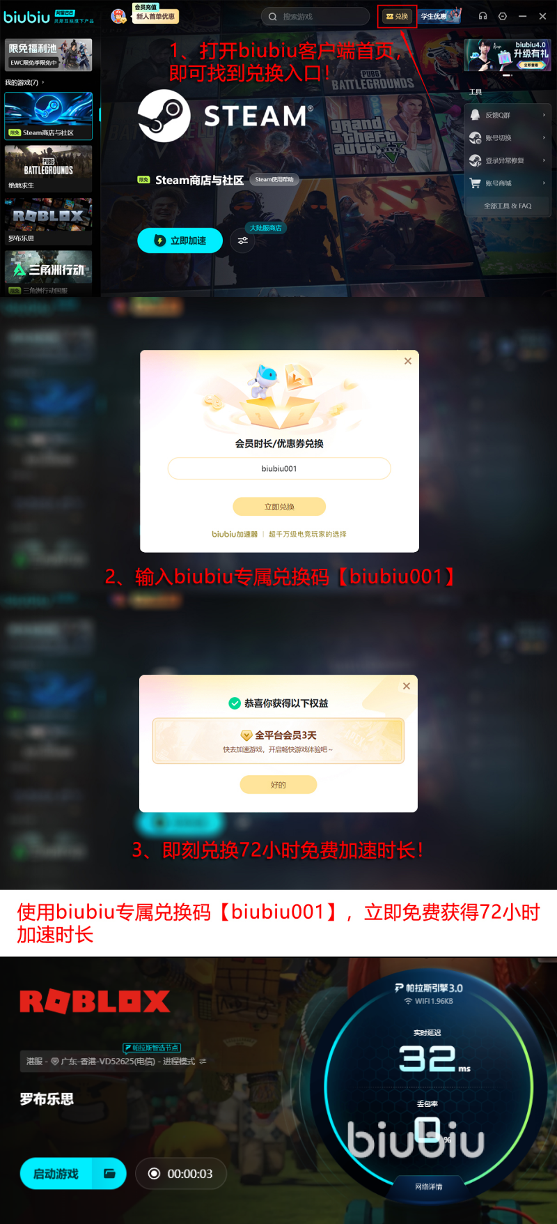 biubiu加速器作为一款Pero战队指定的专属加速器,实力早就已经被认可,背后还会拥有着帕拉斯3.0引擎,另外还有阿里巴巴灵犀互娱技术。让这款加速器在加速领域早已站稳脚跟,不管是休闲游戏还是大型竞技游戏,都会拥有极致的加速体验。现在还会针对新老用户推出免费加速福利,对新用户而言,可以叠加两种福利,在刚刚注册之后下载,有一个24小时新手福利。使用通用兑换码【biubiu001】还可以解锁3天的加速时长,一共可以免费96小时。