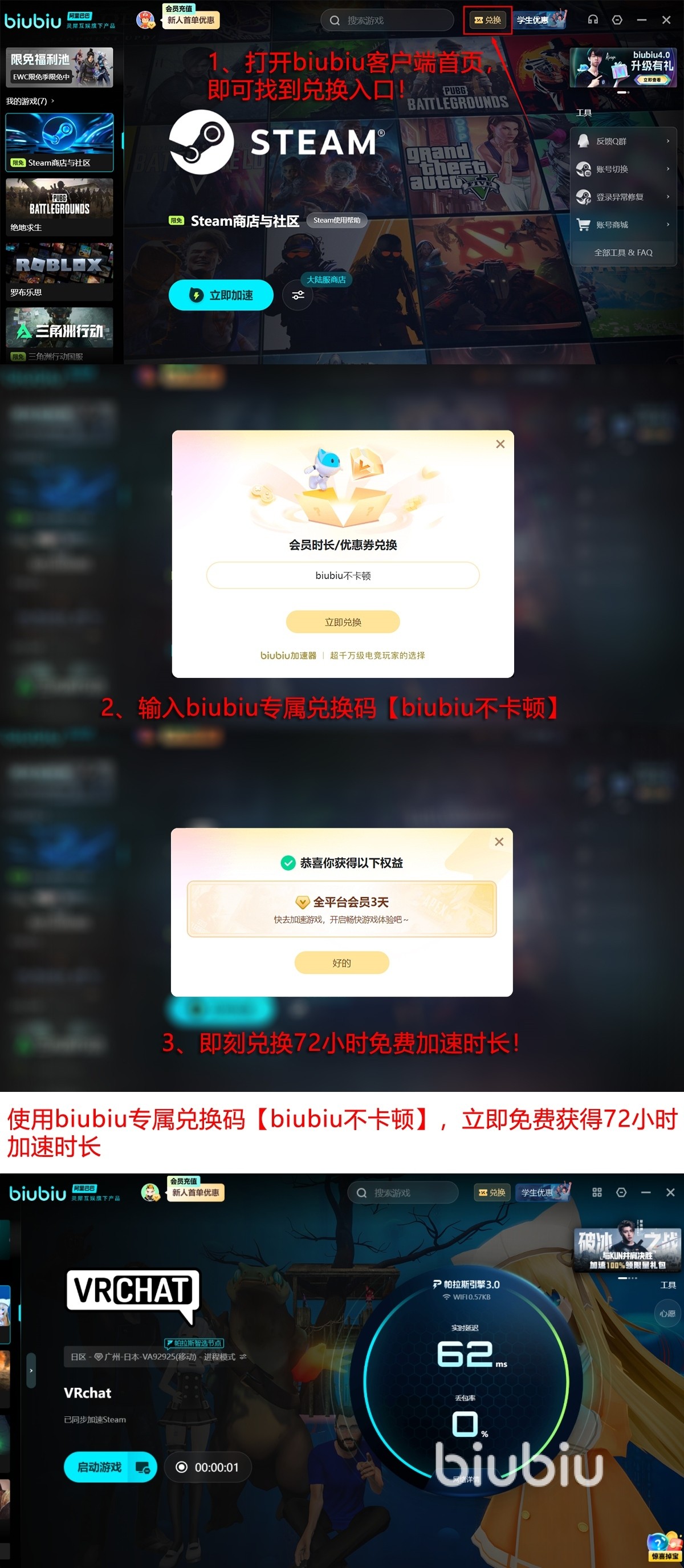 那么关于VRchat卡顿怎么办就介绍到这里了。对于大部分喜欢在这款平台上娱乐交友的玩家而言,不仅要开模型摄像头同捕,还要在线的加载其他朋友的模型,搭上biubiu帮你解决卡顿老毛病,让虚拟互动丝滑到底。