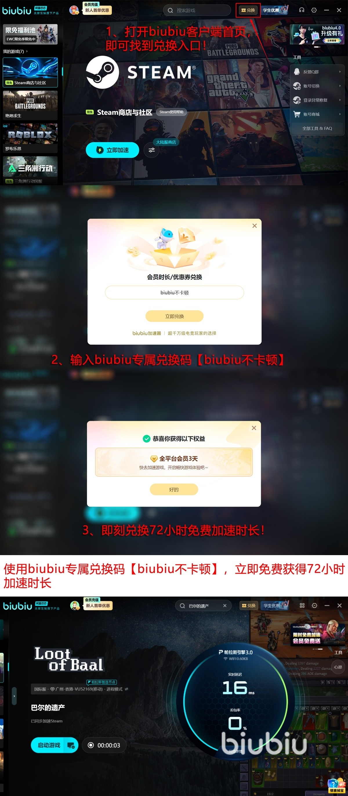 不想卡成PPT,就别错过biubiu这波福利。现在新人注册直接免费领取24小时的加速时长。而且不论你是萌新还是老用户,输入【biubiu不卡顿】的口令,通通拿下额外72小时免费加速。两项叠一叠用,新朋友最多能领到96小时的全功能体验权益。此外,平台还提供了多个灵活的套餐可选,选择合适自己的充值方案,性价比很高。平时还可以多关注轮换的大作限免池,挑选有限免角标的作品就能参与体验。