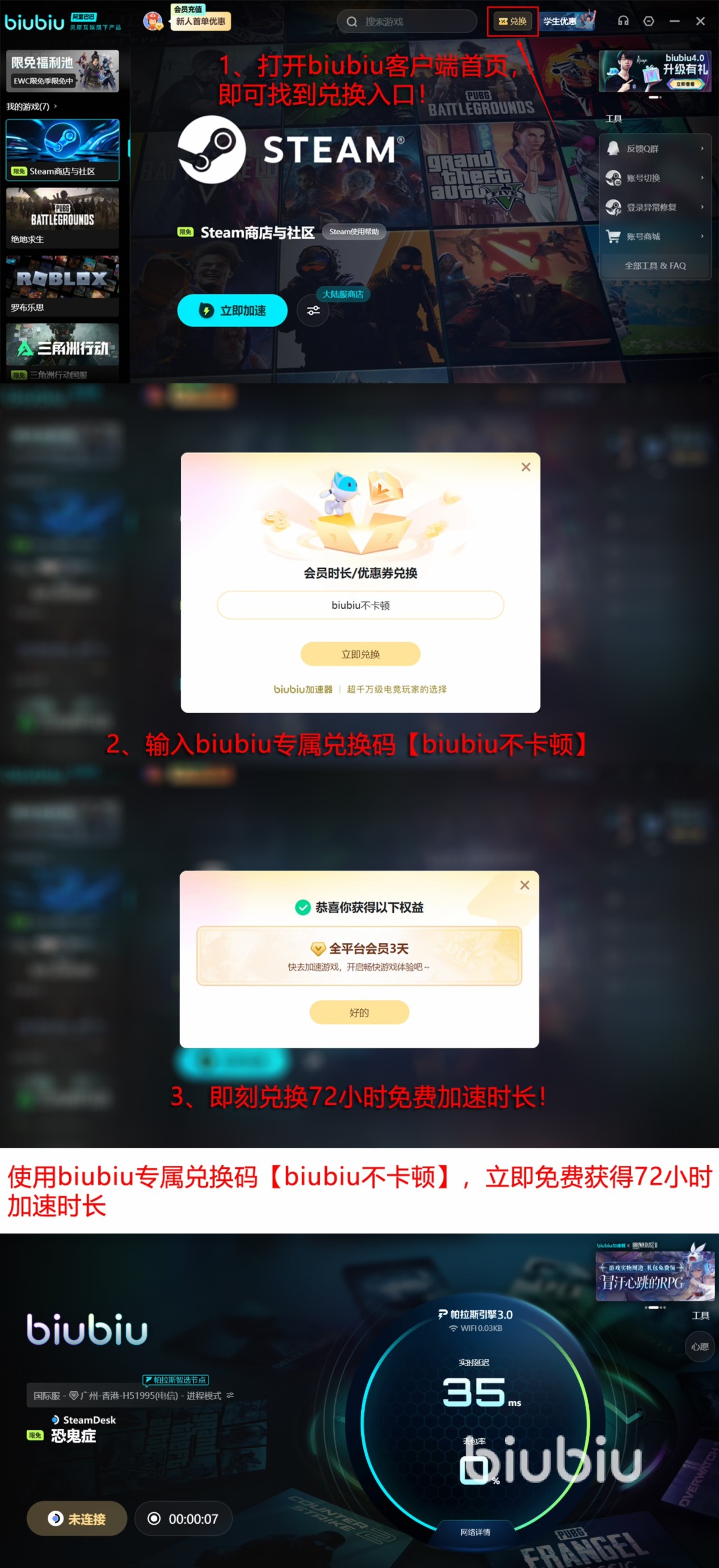 选择biubiu的好处不仅仅在于智能高效加速,还有丰富的攻略内容,对于快速通关恐鬼症这款游戏会有非常大的帮助。首次注册并登录的新人用户还能获得加速器专属的新人24h免费加速福利,新老用户皆能用【biubiu不卡顿】这个口令,在加速器的兑换上领到3天的免费加速。在这样的加速福利之下,可以从游戏一开始就启动加速,流畅的游戏画面能让玩家更快更及时的辨识到画面中的鬼魂类型,还能很快的找到画面中提示的关键证据等,大大增加了玩家在游戏过程中的趣味体验。
