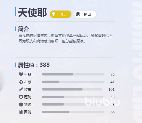 从基础面板来看,伊莫天使耶在同等级角色中展现出显著优势:总属性达388点;生命值为75点,保障中等强度战斗中的生存韧性;击破属性41点,可有效应对高防御目标;攻击属性高达101点,构成主要输出基础;物理防护53点与魔法防护共同提升容错空间;回能效率65点,支持高频技能释放与持续作战节奏。被动效果“电能激荡”使原属性伤害提升12%,进一步强化爆发输出;而“雷翼姿态”可在普攻或命中时积累契约层数,叠满30层后立即触发专属效果,形成稳定增益循环。