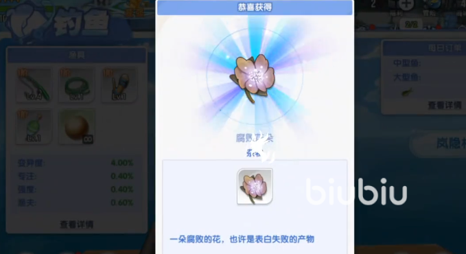 后续又出现“腐败的花”,甚至连续数次空竿,仅见进度条缓慢增长,体验感明显下降。究其原因,关键在于未充分理解影响垂钓结果的核心参数:专注度与变异度。当前4%变异度正位于水生生物掉落判定阈值区间,微小变动即可显著改变产出分布。若初始属性全为零,则极大概率仅获得杂物类道具。