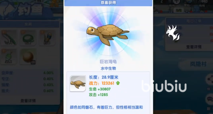 当前装备为一阶钓竿、一阶鱼线与一阶鱼钩,变异度固定为4%。表面看数值普通,实则直接影响产出质量。首竿即获“巨岩海龟”,体长28.9厘米,生命值30807,战斗力123261,攻击力1285——该结果印证了基础配置亦有出彩潜力。但需注意:并非每次甩竿都能收获理想目标,大量玩家反馈频繁钓得无用物品,例如“黑黝黝的旧鞋”。
