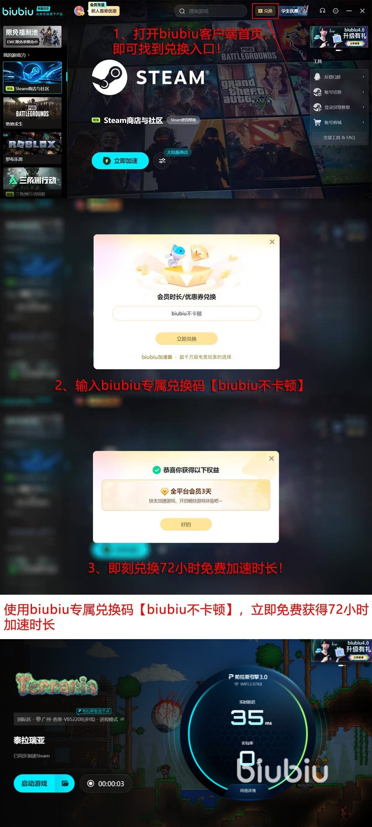 当前新用户注册即可领取24小时全节点加速时长;完成首次登录后,输入专属口令【biubiu不卡顿】,还可额外获赠72小时加速权益,总计享96小时无限制联机优化服务。
