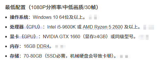 根据官方公布的信息,PC端最低运行分辨率需支持1080p,以确保基础画面完整性;显卡建议不低于NVIDIA GeForce RTX 4060级别,可稳定呈现高帧率与完整光追效果。CPU、内存及存储空间等其他参数,请参照下方图示所列的最低规格清单进行对照。