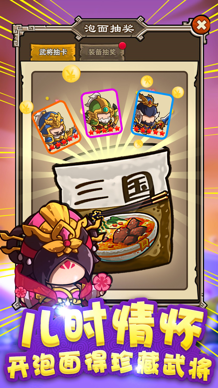 相信各位玩家小时候都有买泡面抽卡,收集卡片的经历,这款游戏设计的初衷便是如此,在泡面三国里,各位玩家也可以开到珍稀品种的三国武将卡,泡面三国这款游戏完美的对儿时收集泡面卡片的心情进行复刻。