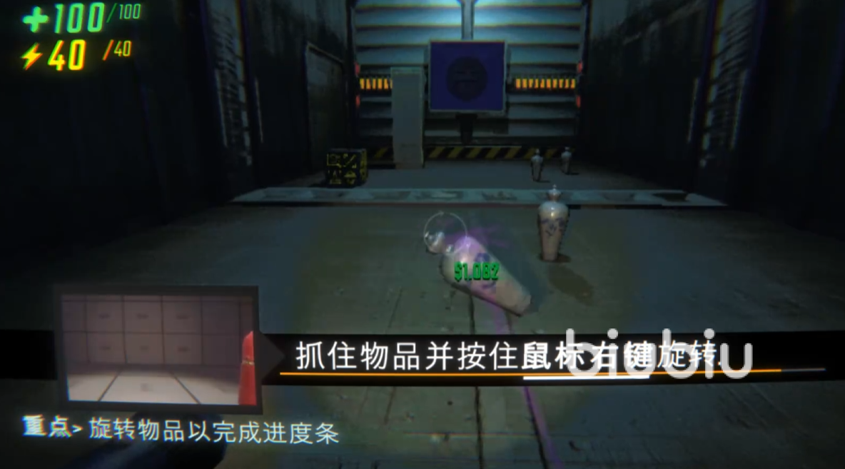 然后需要学习将物品抓在手里,用鼠标右键来操控旋转。抓取操作针对单一目标实现还是很简单的,但是正常场景当中道具是非常多的,使用E键就可以切换物品,当道具扎堆在一起的时候,这样才能更好的选中目标来回收。