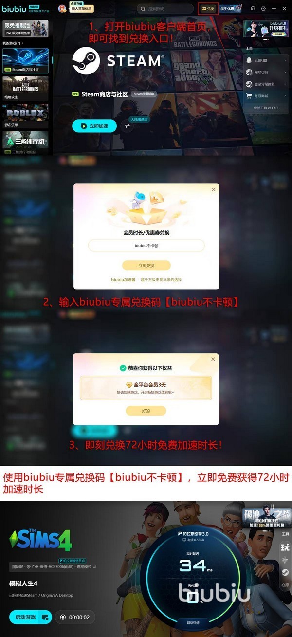 如果你还担心它的效果是否真的有介绍的那般好,可以直接去适用一下,给新用户提供了超多的体验时长。现在,新用户注册登录能自动得到24H的免费时长,这个是自动给的。还可以使用“biubiu不卡顿”这个口令去兑换3天的体验时长,这个是什么时间时候都能换的,新老用户都可以用,不过只能换一次,并且输入时要区分大小写。