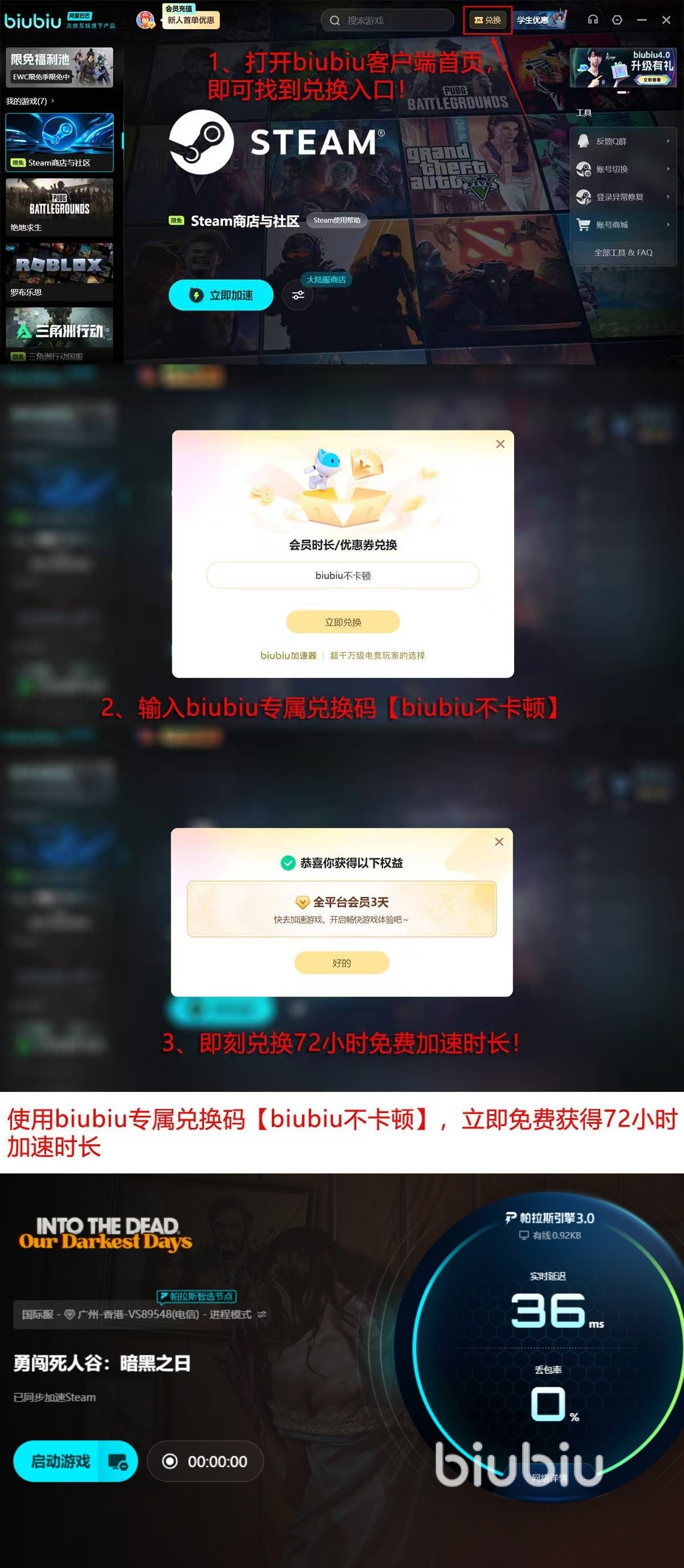 现在这款加速器对于新人有着不错的福利,首先是新用户可以享受24小时的免费加速,如果用兑换码【biubiu不卡顿】的话,那还能够额外的获取3天的免费加速,我们一共能够获取到96小时的免费加速时间。