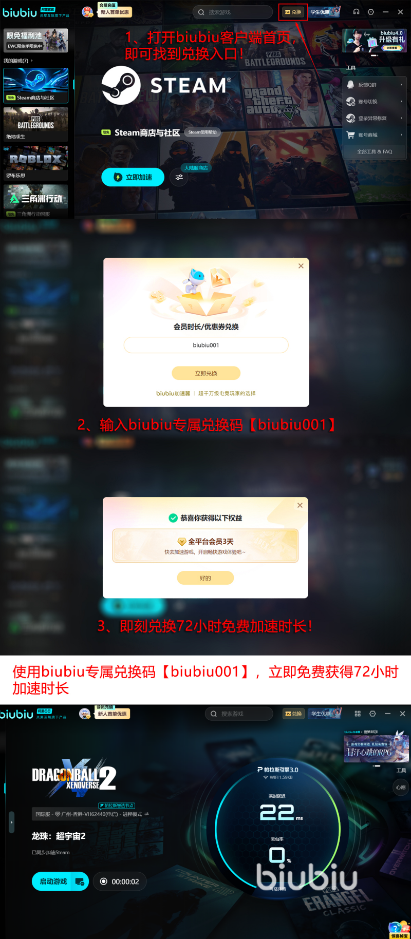 完美适应多平台和相应的掌机设备,比如steam、ea等,支持国内外海量热门作品,超过上万款游戏一键加速,轻松畅玩目前针对于新老用户都送出免费试用福利,新注册用户只需注册之后,即可获得24小时免费加速时长,所有新老玩家利用兑换码【biubiu001】成功解锁三天免费加速福利,新用户将两个活动全部领取之后,免费时长叠加至96小时。