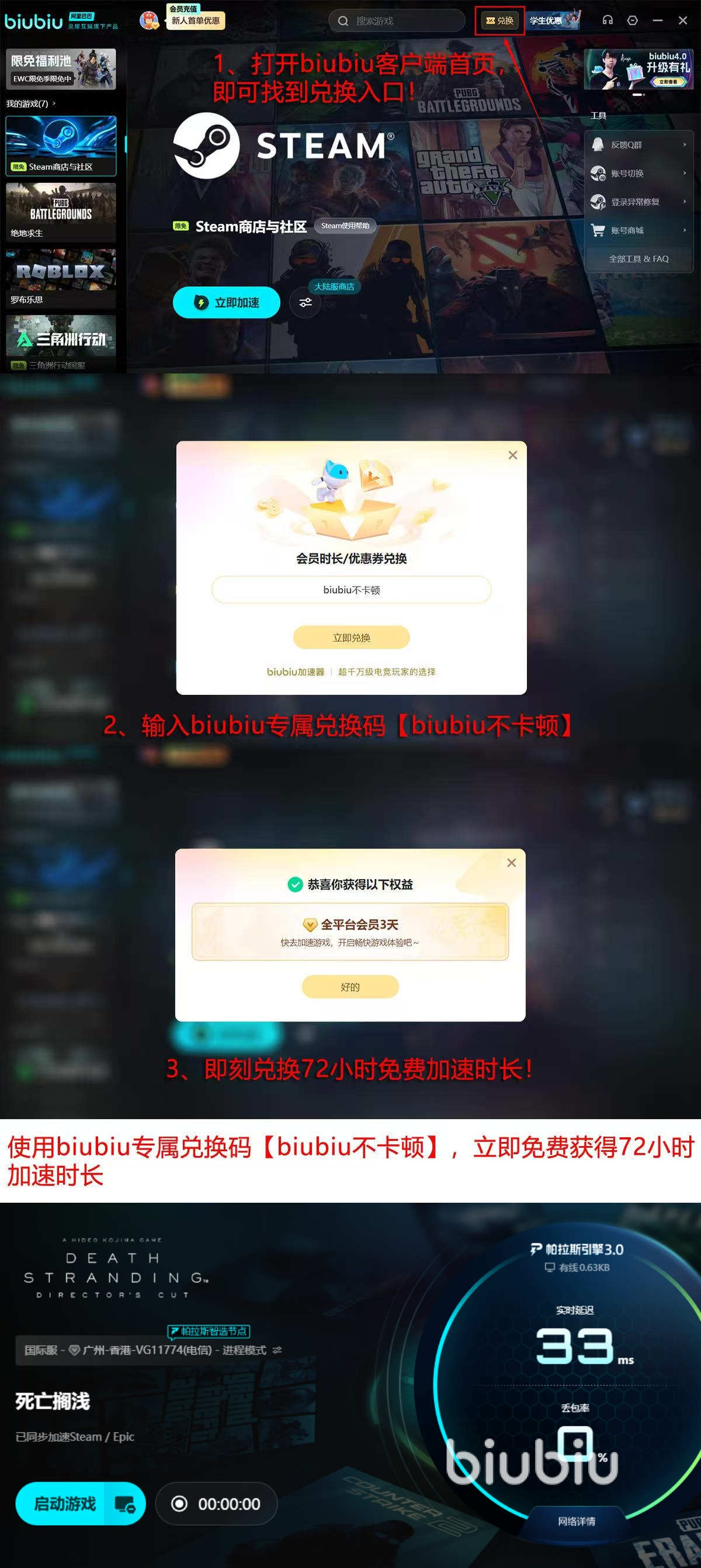 该活动中用户只需要输入【biubiu兑换码】那么可以兑换72小时的免费加速时长,之后如果还是新用户的话,那还可以在这个基础上再去领取24小时的免费加速时长,一共就是96小时可以白嫖的时间,这个福利力度也是很少见的。