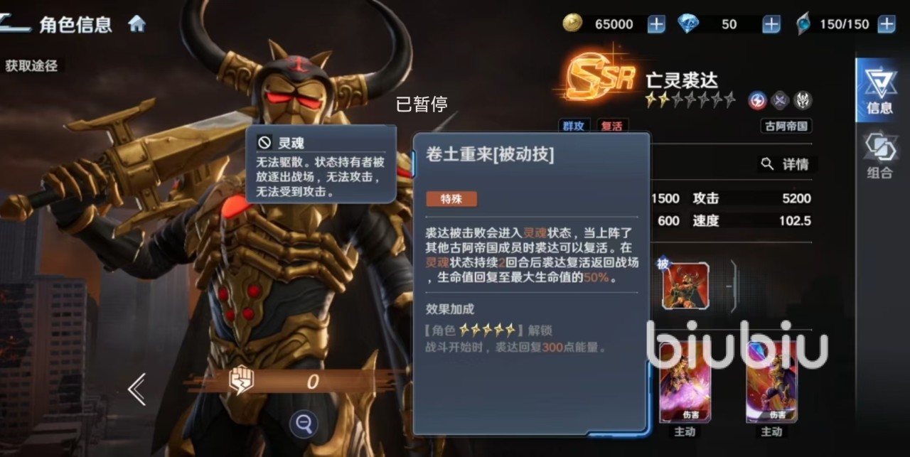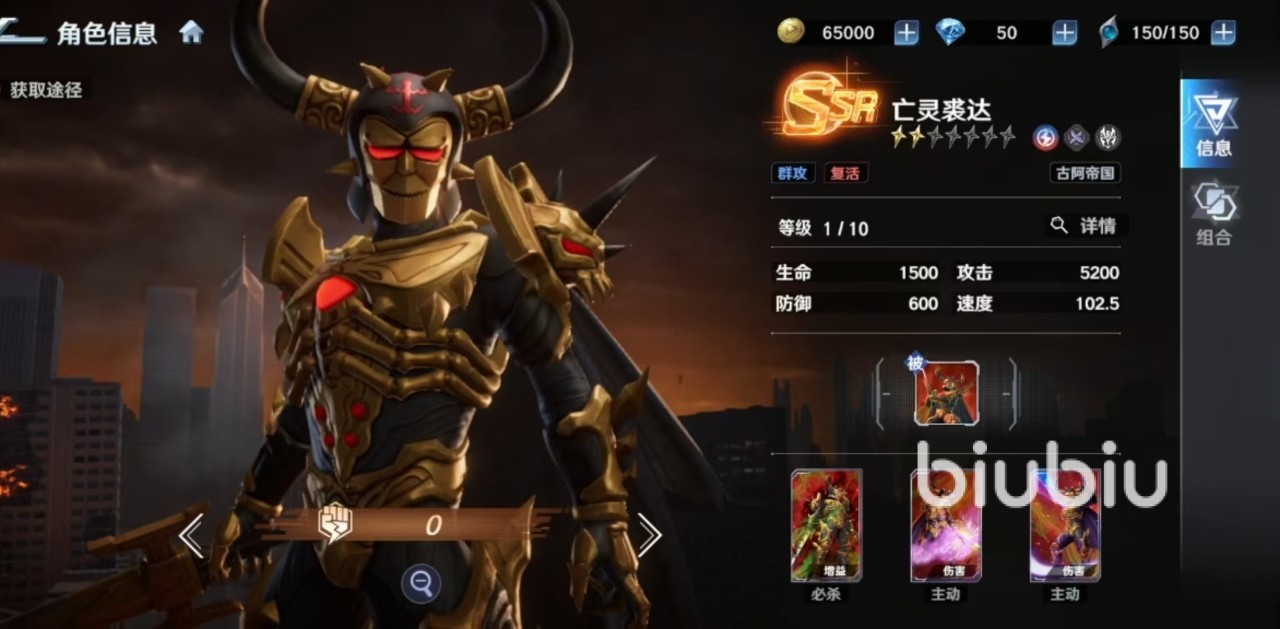 亡灵裘达隶属古阿帝国阵营,外观以巨大双角为标志性特征,辨识度极高。其核心定位为兼具持续作战能力与群体压制力的战术型输出单位。角色被动技能名为“卷土重来”:当亡灵裘达被击败时,并不会直接退场,而是进入灵魂状态;若队伍中同时存在至少一名其他古阿帝国成员,则可立即复活并恢复部分生命值。该机制显著提升了容错率与续航能力,是其区别于常规SSR角色的关键优势。