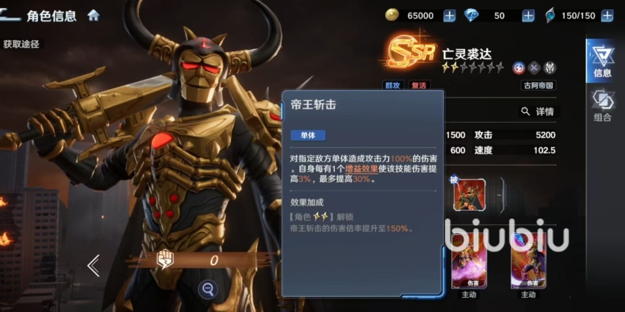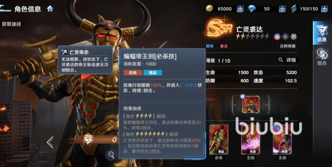 必杀技“蝙蝠帝王剑”是触发质变的核心技能。释放后,亡灵裘达立即提前行动100%,并强制进入“亡灵帝态”。在此状态下,其常规技能“帝王斩击”冷却时间归零,且获得暴击率提升与攻击力提升双重增益;若成功击杀敌方单位,该状态将自动延续一回合。这意味着在理想操作下,亡灵裘达可持续维持高强度输出节奏,形成滚雪球式压制效果。