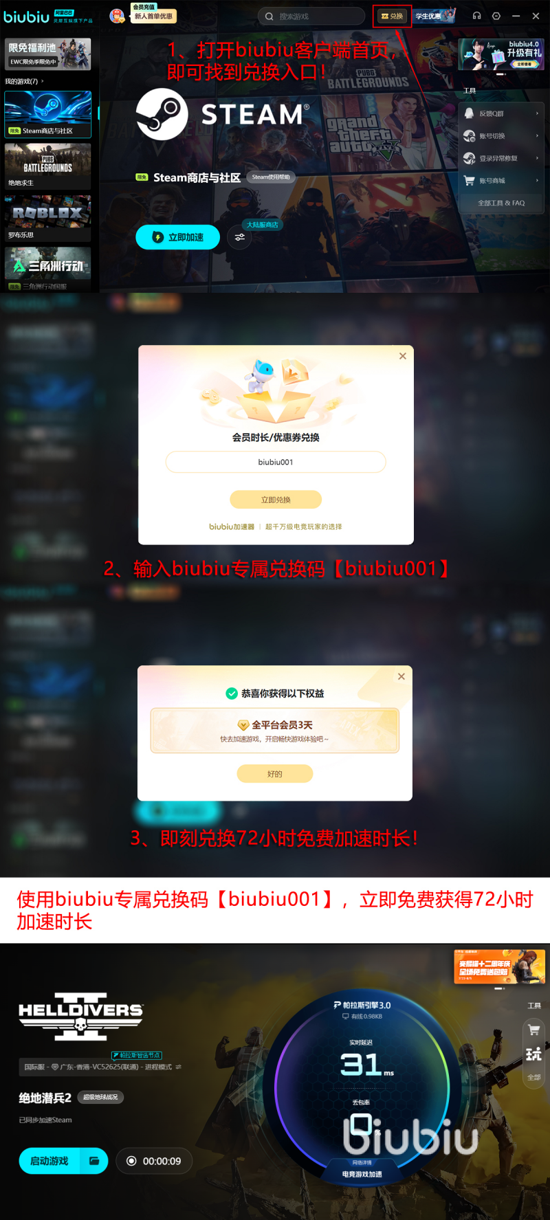 biubiu加速器在行业内的实力早就已经得到了顶尖玩家的认可。这可是一款PUBG冠军选手XDD(小叮当)的指定加速器,可以满足职业选手的需求,由此可见在加速上是多么的稳定,背后还有阿里巴巴灵犀互娱大厂技术。网络覆盖以及技术更新换代的能力,在行业内都会处于领先的状态。可以让玩家在体验游戏时更加的顺畅,现在也有好消息要告诉大家,会给大家推出三重福利。每一个用户都可以通过通用口令【biubiu001】兑换3天的加速时长。对新用户而言,可以额外的享受24小时的新手福利。另外,新手可以将两种方法叠加在一起,累积就可以免费长达96小时,彻底的告别闪退困扰。