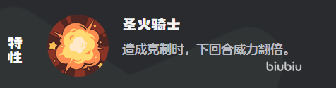 其核心机制源于特性【圣火骑士】:当炽心勇狮造成属性克制伤害后,下回合所有攻击技能的基础威力提升至200%。该效果不依赖触发次数,仅需一次有效克制命中即可激活,且可与后续技能效果叠加。尤其在对抗水系目标时,首回合打出克制即锁定第二回合双倍输出,若敌方缺乏即时压制手段,战斗节奏将迅速向炽心勇狮倾斜,形成持续增益的滚雪球效应。