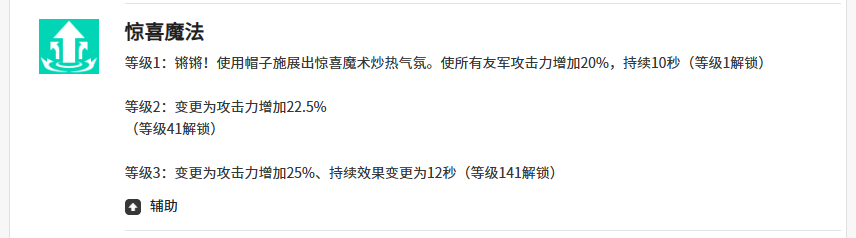 “惊喜魔法”提供持续10秒的群体攻击加成:施放瞬间提升自身20%攻击力,并使周围所有友军同步获得20%攻击力提升,显著增强队伍整体输出节奏。被动技能“花招百出”则构建防御纵深——当敌方发动暴击时,我方全体单位所受暴击伤害降低20%;同时,所有友军的魔法暴击率提升20%,兼顾生存与爆发双重维度。
