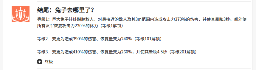 终极技能“兔子去哪了”召唤巨型兔子玩偶,对弗里姆3米范围内最近敌人造成370%攻击力的高额伤害并附加3秒眩晕;技能生效后,全体友军还将获得相当于弗里姆攻击力220%的体力恢复。这意味着其治疗收益随自身攻击属性成长而线性提升。支援技“连续飞刺”则聚焦队长协同:为全队恢复相当于队长精灵攻击力250%的体力;若队长精灵同为辅助定位,还可额外赋予全体友军15秒内10%暴击率与10%速度加成,极大优化队伍机动性与爆发窗口。
