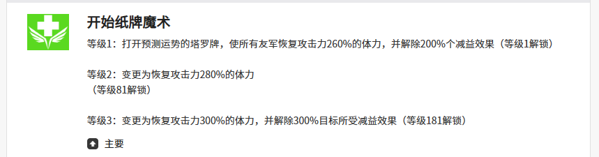 核心技能“纸牌魔术”可展开多张塔罗牌,触发后为友方单位提供相当于自身攻击力260%的体力恢复,并在清除200%减益效果的同时,进一步提升自身治疗量。该机制使其在高压环境下的团队维稳能力尤为突出。另一关键技能“应该不会出现鸽子吧”具备范围双效:以当前生命值最低队友为目标,在半径1.8米、长度8米的扇形区域内,为全体友军恢复相当于自身攻击力130%的体力;同时对范围内所有敌人造成等额130%攻击力的伤害,实现攻防一体的战术价值。