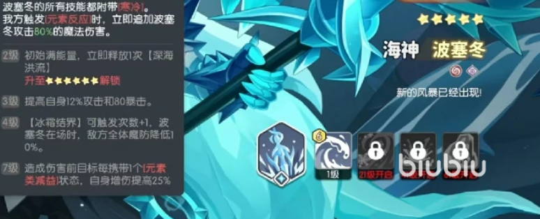 波塞冬共配备4个主动技能与1个被动技能。一技能为奥义技,需消耗6点能量释放,具备大范围群体伤害效果,但无附加状态或增益效果,实战定位偏向基础清场与能量周转,功能性侧重于技能循环衔接而非爆发压制。