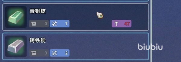 青铜架须在中级加工台上合成,单个消耗青铜锭5枚与青铜铆钉4枚。而青铜锭由铜矿石与锡矿石按3:2比例熔炼而成;青铜铆钉又需以青铜锭为原料再次加工。经逐层折算,仅完成两个桁架所需的3×2=6个青铜架,就需铜矿石63个、锡矿石42个。