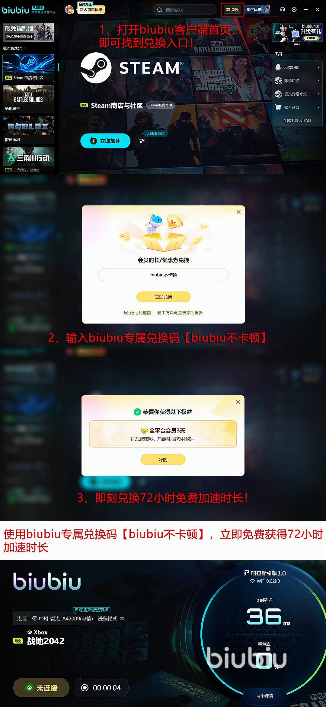 大量实测用户反馈,启用biubiu加速器后,《战地2042》平均延迟下降约40%,连接稳定性提升显著,卡顿与掉线频次大幅减少。新用户完成注册即可领取24小时全场游戏通用免费加速时长;输入专属兑换码【biubiu不卡顿】还可额外获赠3天加速权益,总计享96小时免费服务;该福利同样面向老用户开放,无身份限制。