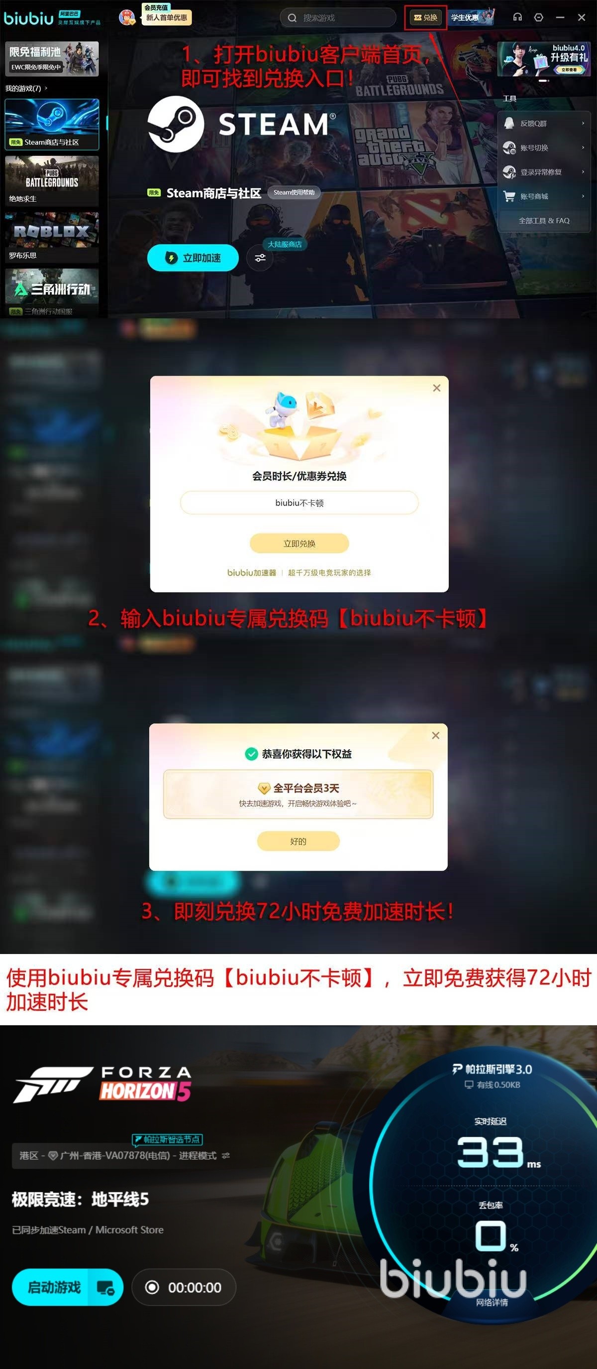新用户注册后可立即领取24小时全游戏免费加速权限。当前还可通过输入兑换码“biubiu不卡顿”,额外激活72小时连续加速服务,两项权益支持叠加使用,无需重复绑定设备。