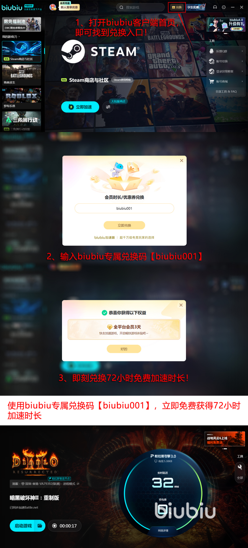 该加速器已在专业电竞领域获得验证,曾为PUBG职业选手小叮当提供赛事级网络支持。其底层技术整合了九游、交易猫与biubiu加速器三大产品所共用的阿里巴巴灵犀互娱研发体系,并融合帕拉斯3.0引擎架构,在协议优化、数据压缩与抗干扰能力方面具备技术积累。当前平台开放限时福利:所有用户可在加速器官网页面输入口令【biubiu001】领取3天免费加速时长;新注册用户还可额外获赠24小时专属权益。两项福利可叠加使用,最高可享96小时连续加速服务。