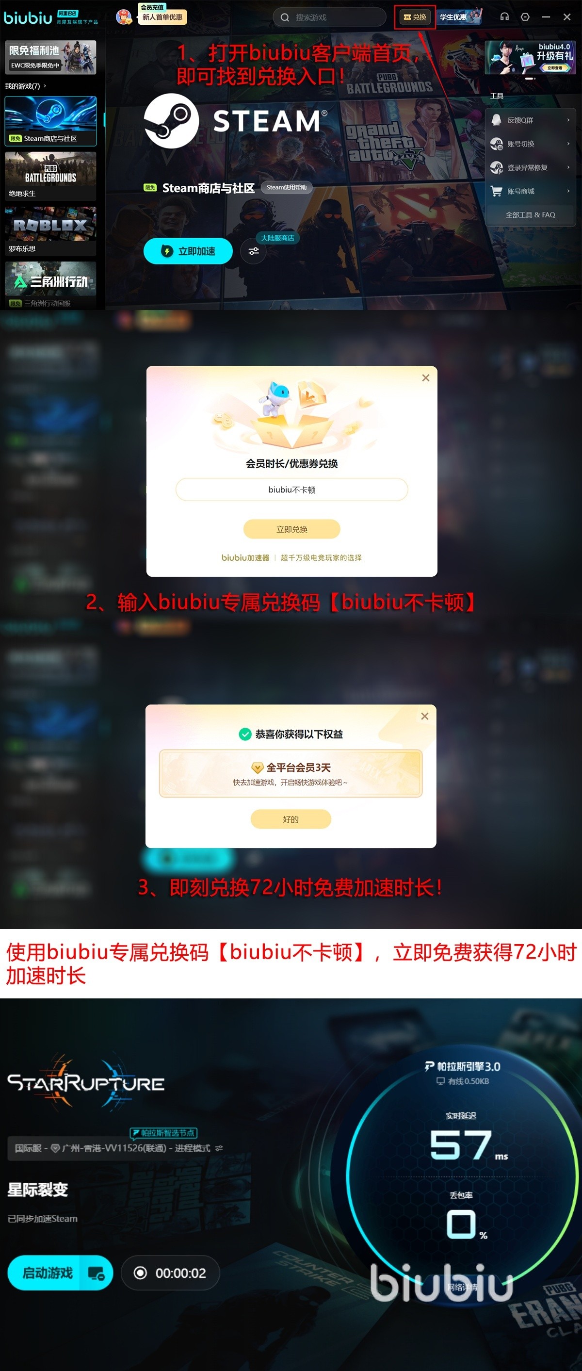 新用户注册biubiu加速器后,可立即获赠24小时全游戏免费加速时长,用于深度测试其对《星际裂变》的适配效果。完成基础绑定后,输入专属兑换码【biubiu不卡顿】,还可额外领取72小时加速权益,总计提供96小时无门槛体验周期。该福利面向所有账号开放,无需付费订阅,便于玩家全面评估加速效能是否满足自身网络环境需求。