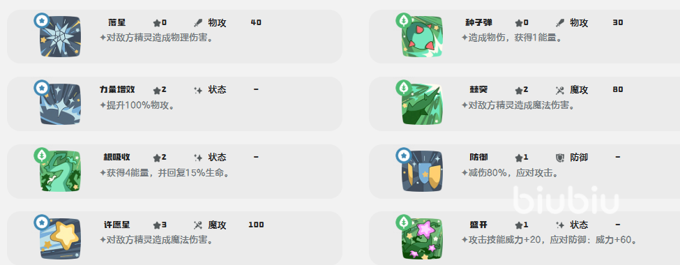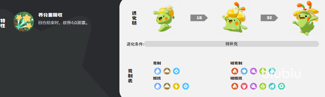 奇丽花的核心机制围绕“能量积累”展开:其特性可在每回合结束时自动恢复4点能量。技能配置上,种子弹提供基础物理输出并附带1点能量返还;超吸收则在登场首回合即获得4点能量,并恢复15%最大生命值,兼顾续航与启动效率。许愿星为低魔攻消耗的魔法伤害技能,适合清场或补刀。而光能聚集是其核心输出技——不仅造成魔法伤害,更关键的是:每次使用任意草系技能后,该技能基础威力永久提升60点(可叠加),显著强化持续作战中的爆发能力,但相应地,能量消耗亦随之升高。