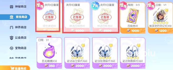 【竞技商店】主打高价值召唤资源,神话召唤卷为首选,用于抽取核心角色;源生琥珀次之,两者均建议在资源充裕时优先兑换。神话召唤卷因抽卡需求刚性更强,应确保稳定获取节奏。