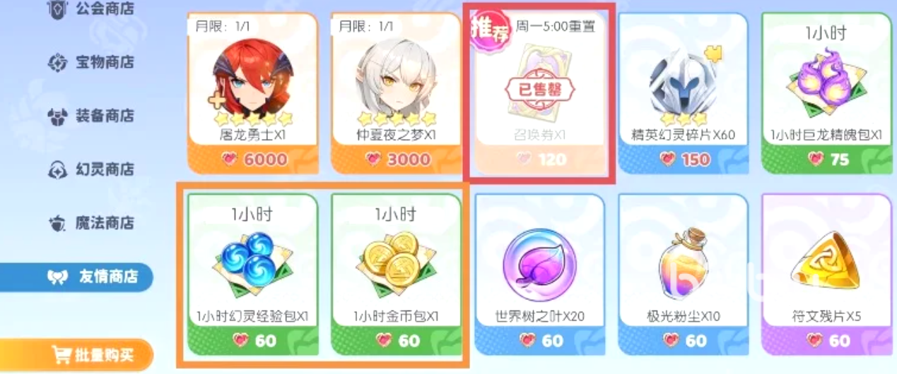 【友情商店】召唤券为每周稳定兑换项,其余道具根据角色养成缺口选择性补充,无强制推荐。