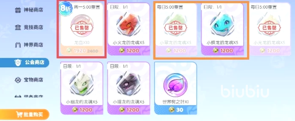 【公会商店】龙血为必选资源,关系到公会技能升级与团队增益,务必每周清空;小龙碎片则建议每日全额兑换,用于主力龙系角色突破,积累周期长、不可替代性强。