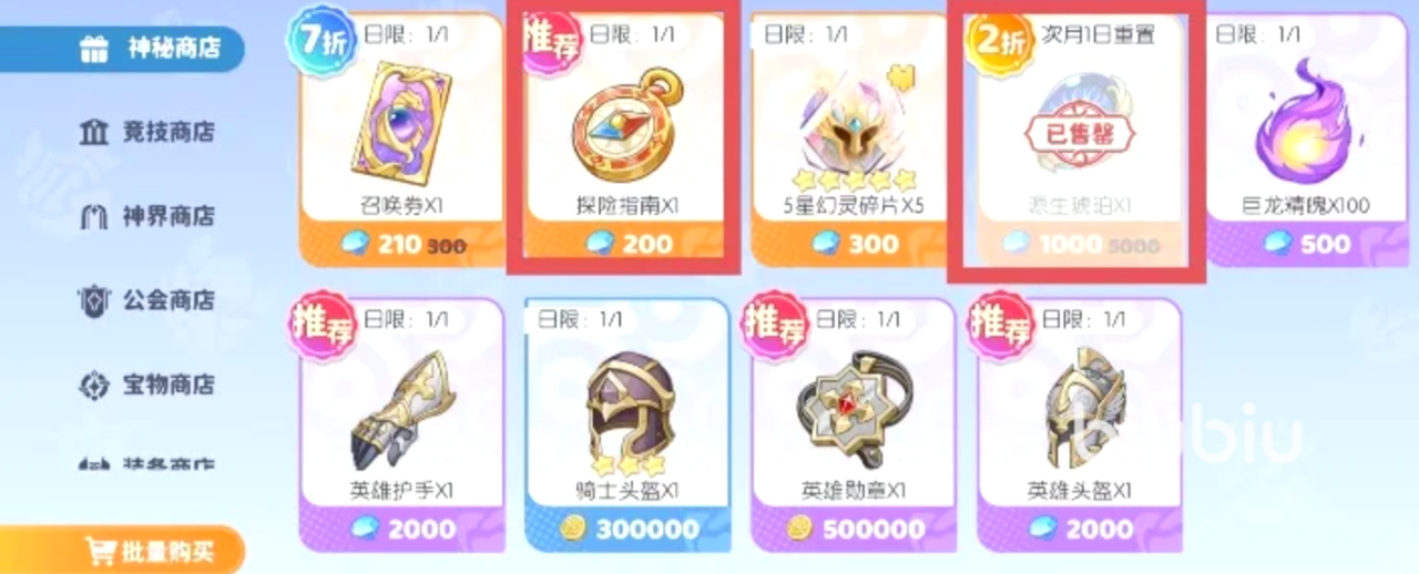【宝物商店】极光晶石(神器强化材料)与宝物(含各类专属神器)按实际进度灵活配置。若当前处于神器升阶高峰期,二者均可每日采购;若阶段需求平稳,可适当控制频率。