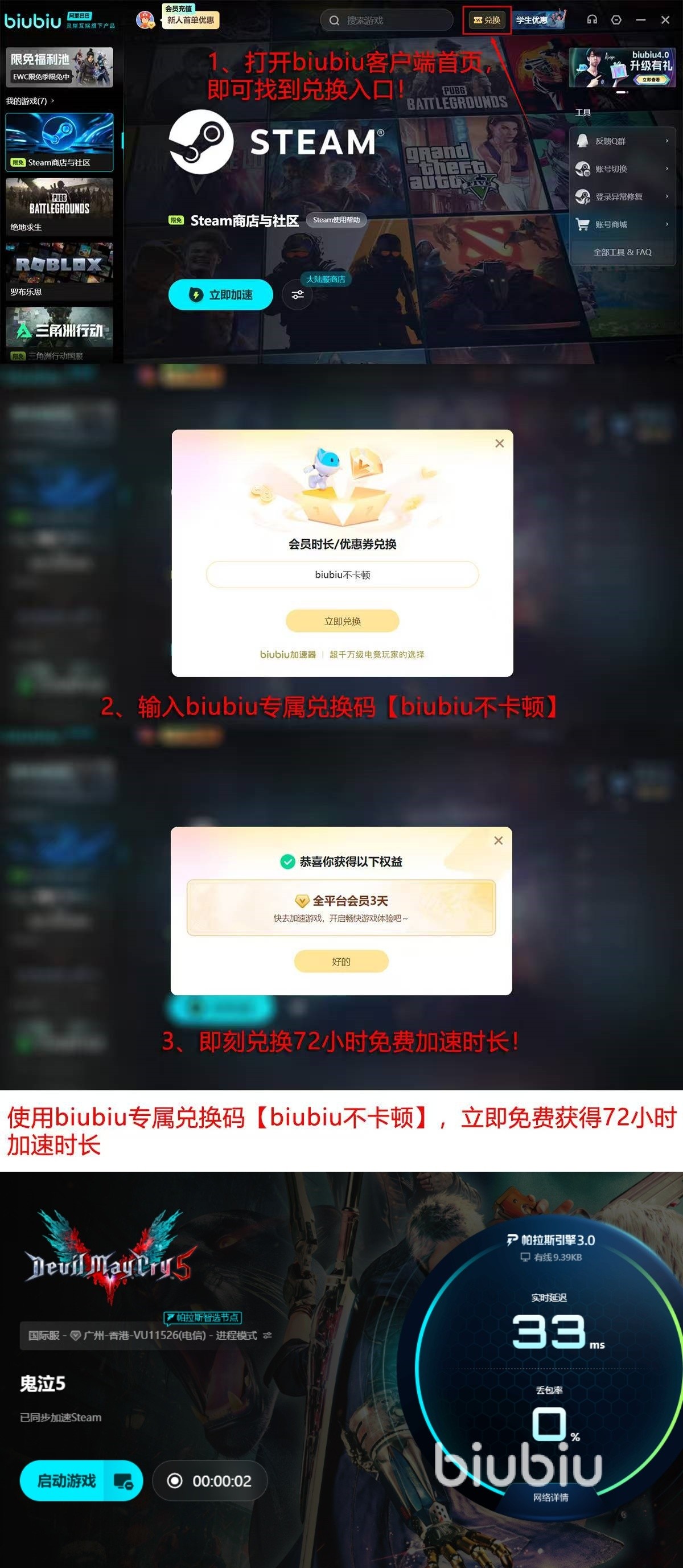 尚未安装的用户注意:新注册账号即可领取24小时全游戏通用加速时长;进入主界面后,输入指令码“biubiu不卡顿”,还可额外兑换72小时专属加速权益。两项福利可叠加使用,总计享96小时免费加速服务。