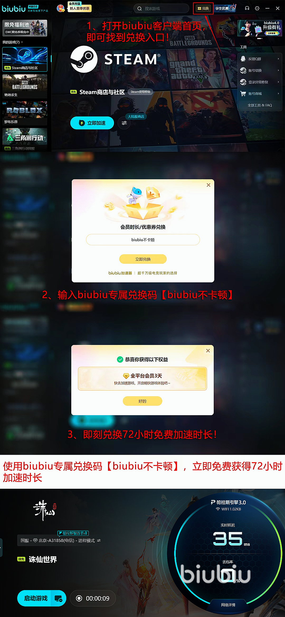 当前biubiu加速器已完成全平台版本迭代,支持Android/iOS/Windows多端协同加速。福利政策持续加码:新用户完成手机号注册后,自动解锁24小时全游戏通用加速时长;所有用户输入兑换码【biubiu不卡顿】,可额外领取3天高级加速权限。两项权益叠加后,总计可享96小时零门槛加速服务,覆盖《诛仙世界》全部服务器及活动场景。