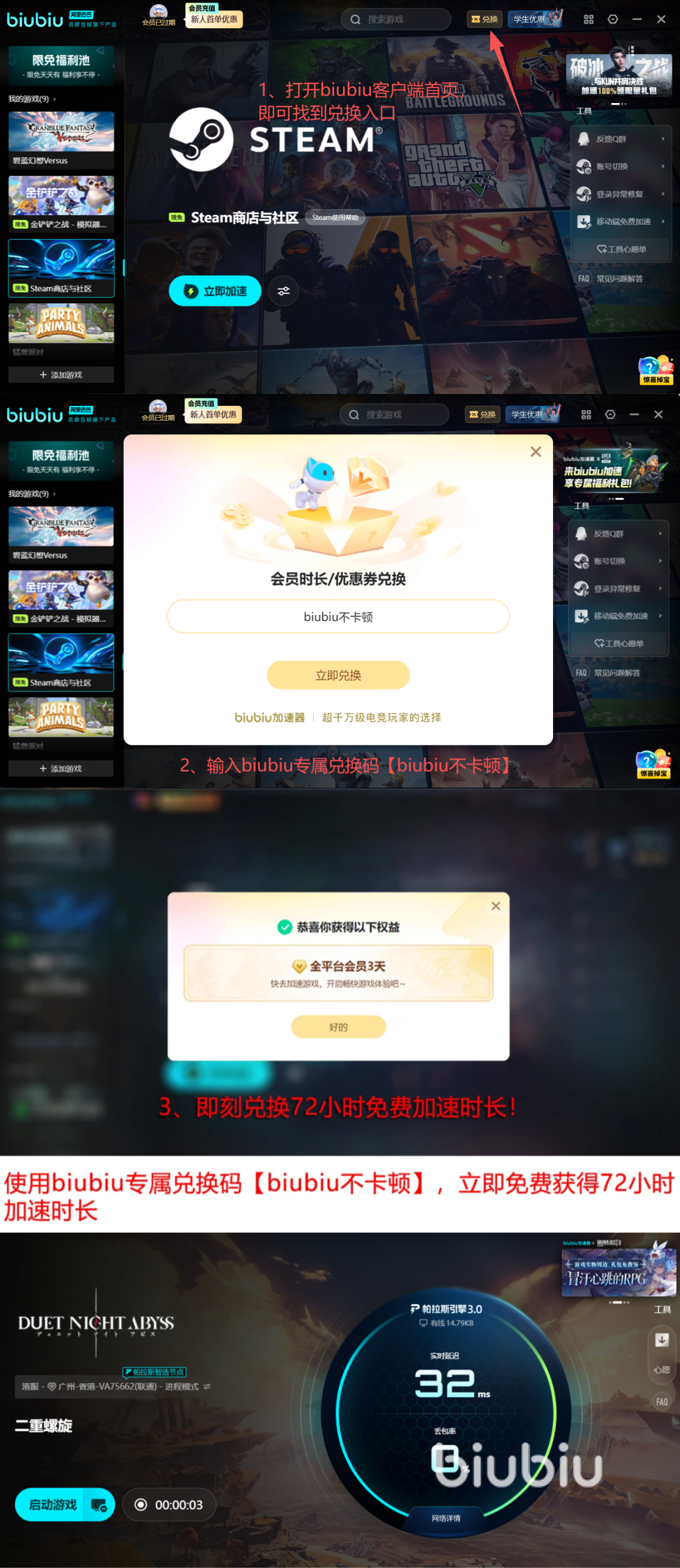 技术演进与用户反馈深度耦合,biubiu加速器已升级至帕拉斯引擎3.0架构,链路预测与冗余切换能力持续增强;特邀PUBG职业赛事冠军左梓轩担任网络调优体验官,将其在高强度竞技环境下的网络参数调校经验系统化注入产品逻辑,助力普通玩家达成接近职业级的15ms级端到端延迟与99.98%连接保持率。当前正值新用户激励期:完成注册即赠24小时高级加速权限,输入专属口令【biubiu不卡顿】,额外解锁72小时加速时长,总计可享96小时全功能试用权益,充分覆盖多轮高难度副本挑战周期,切实应对网络波动带来的运行风险。