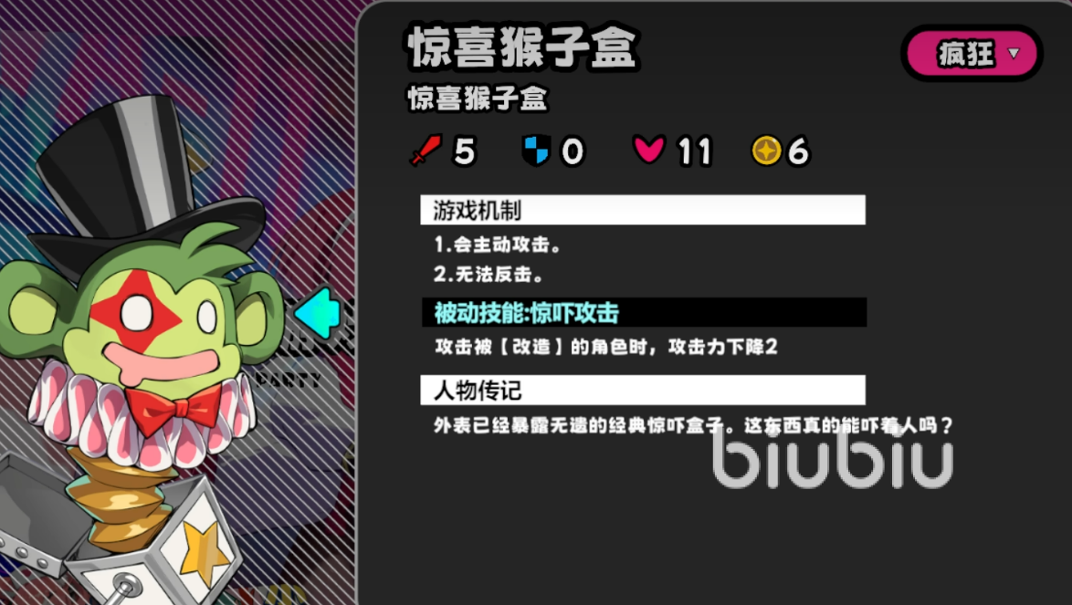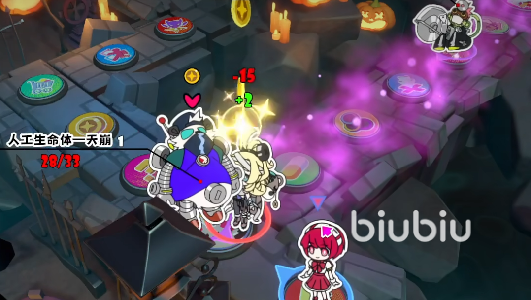 基础怪物“盒子”无反击能力,路径经过即可攻击;击杀后对带有改造buff的目标造成2点攻击力削弱。所有怪物掉落星币数量已在图鉴中明确标注,便于资源规划。精英怪“圆锯猴”具备反击特性,且每三回合为六格范围内未携带改造buff的单位施加三层改造,是改造层数快速累积的主要源头;击败后必掉一张糖果卡,收益可观,建议优先处理。