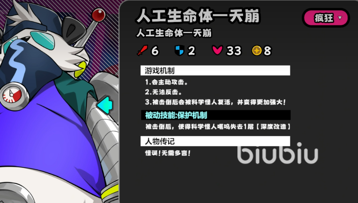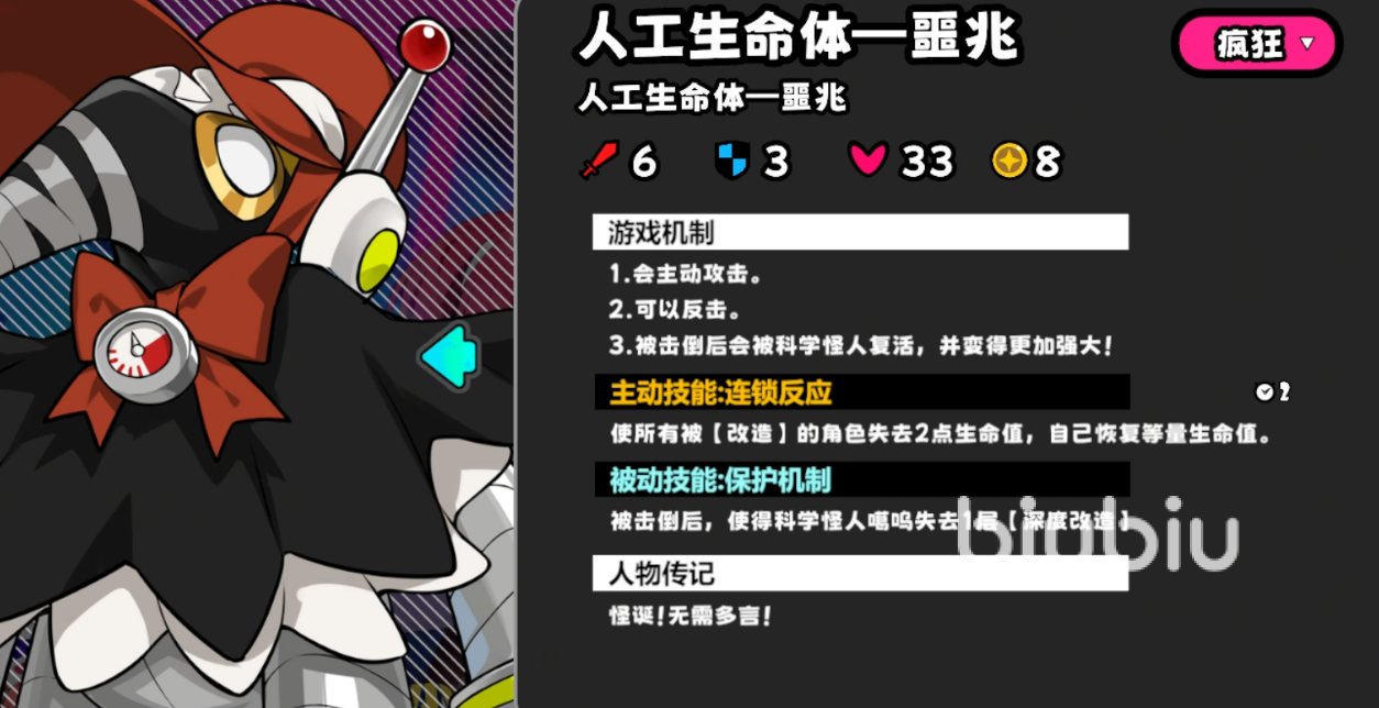 “天崩”无反击,但被击杀后将在下一回合于Boss位置复活为“噩兆”。当进度条达到4时,固定刷新3个盒子与1只“圆锯巨”;噩兆登场同步触发事件,在指定位置生成1只圆锯猴与1只科学怪猿。后者具备反击能力,且攻击携带改造buff的玩家时可提升自身3点攻击力。相较天崩,噩兆新增反击机制,并每两回合对所有携带改造buff的玩家造成2点伤害,同时回复等量生命值。