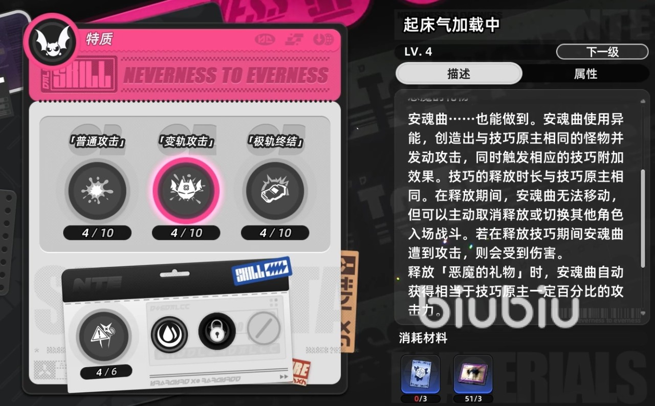 她的主动技能不仅可投掷异能造物造成范围伤害并附加噩梦层数,还支持在释放时激活“拟态召唤”——即根据当前学习目标生成对应形态的异能怪物,并使其执行与该敌人完全一致的攻击行为。此机制赋予安魂曲双重战术价值:既可作为额外输出单元扩大压制面,亦能借怪物攻击节奏创造破防窗口、打断敌方行动或触发协同反应。当玩家切换角色或手动解除拟态状态后,该召唤体将立即消散。