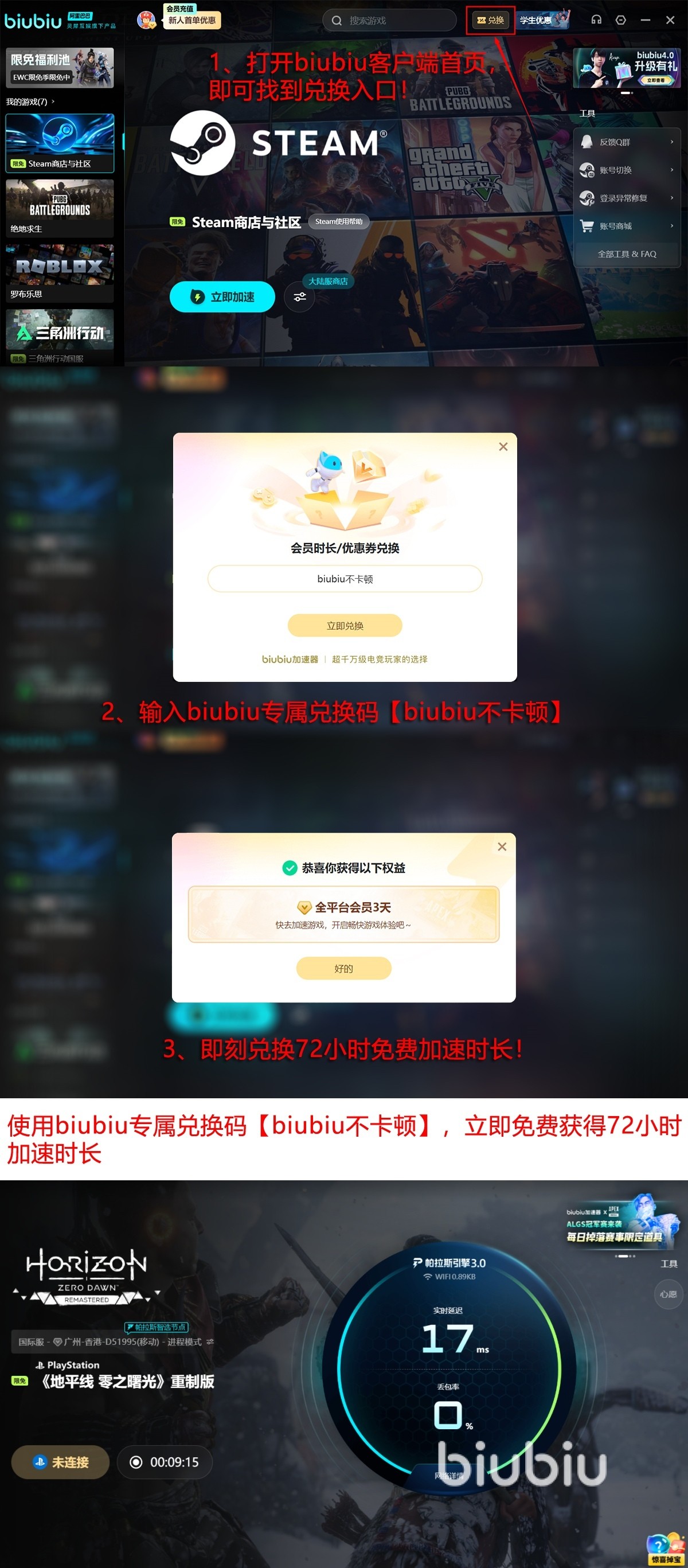 新用户注册即可获赠24小时全节点加速权限;所有用户均可凭口令【biubiu不卡顿】额外领取72小时加速时长。两项权益叠加后,新用户可享总计96小时免费体验,无需付费即可获得稳定低延迟的游戏连接环境。