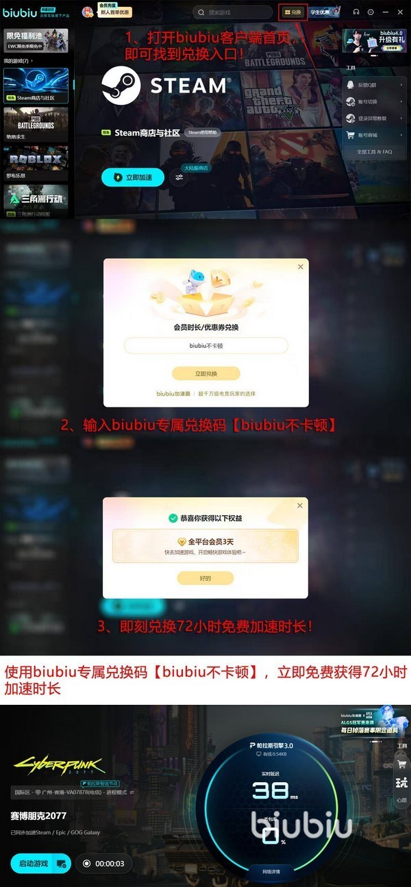 当前版本支持限时体验机制:输入兑换码“biubiu不卡顿”,即可激活3天全平台高级会员权限,新老用户均可使用,限单账户一次性领取,注意区分大小写。此外,首次注册用户在完成账号创建后将自动获赠24小时免门槛试用时长,叠加兑换权益后总计可达96小时,即整整四日的完整加速服务周期。