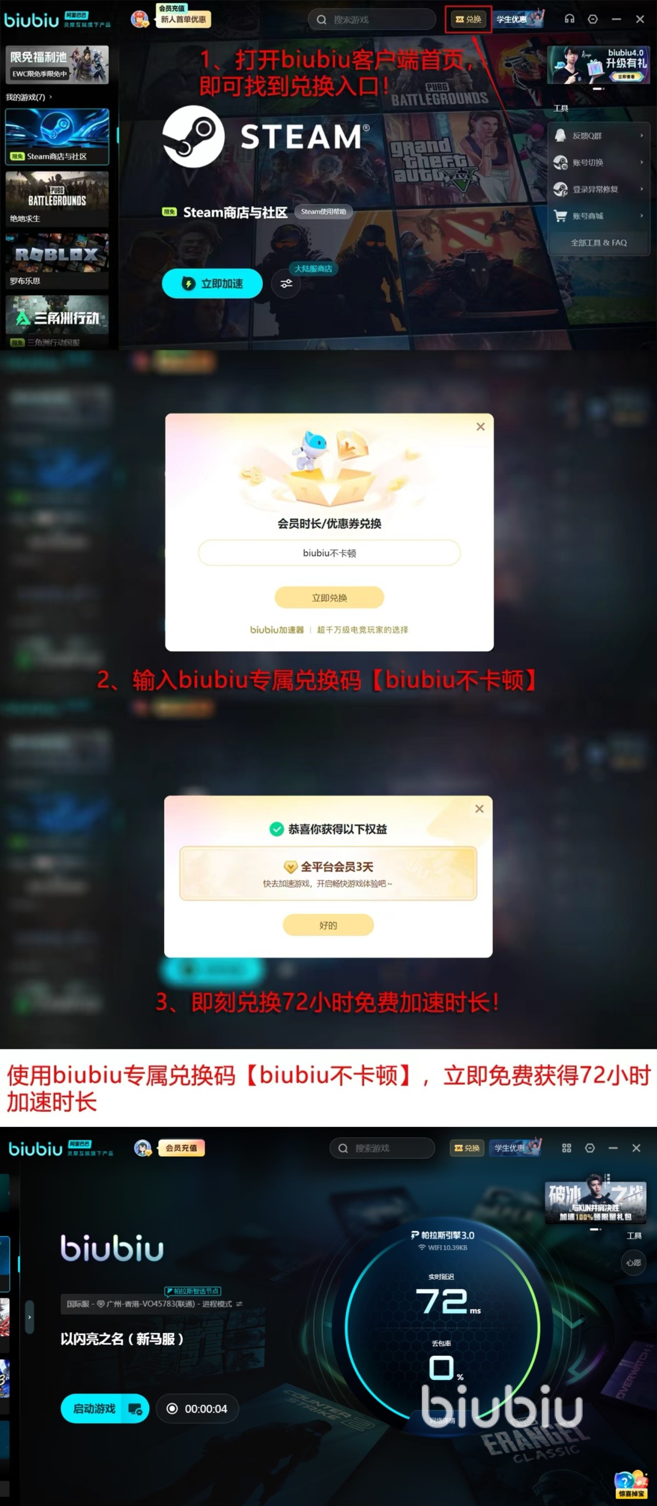 而且biubiu试用体验的难度要更低,新用户注册成功后,账号内就会直接拥有24小时的加速时间,并且官方还准备了兑换码【biubiu不卡顿】,每一个用户都能用这个码兑换72小时的加速时间。